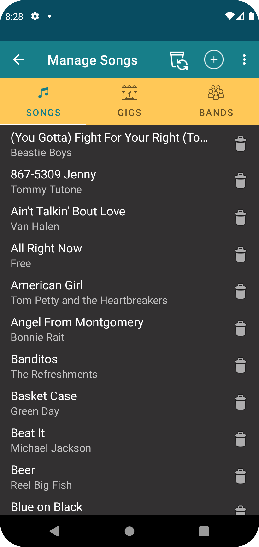 From this display, you can manage the songs in your repertoire, the various gigs you are playing, and the different bands you belong to. This is the main screen where you will add, edit, and delete items in the app.