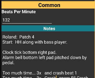 Beats per minute and notes are part of what is called the song variant. The header of this section will show the band name if editing the band variant or "Common" if editing the variant that applies to all bands. The metronome on the Play page will first look at the beats per minute setting for the band performing the song. If there is no tempo setting for the band, the metronome will use the beats per minute set in the Common variant. For the notes, the Play screen will show both the Common notes and the notes for the band assigned to the performance. Keep in mind that variiants are not available in the free version of the application.